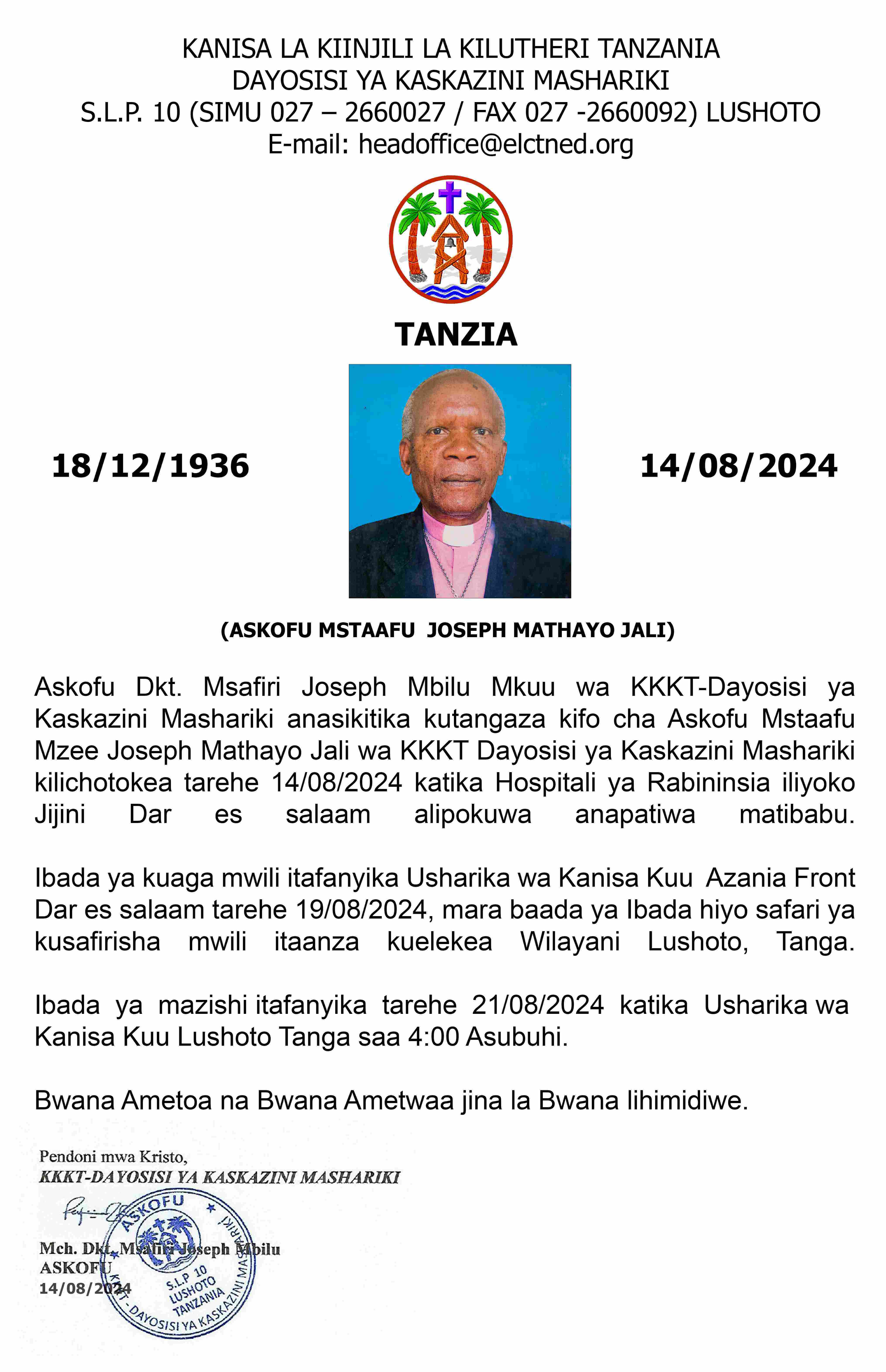 Tarehe 19 Juni 1963, Kanisa la Usambara - Digo na makanisa mengine sita ya Kilutheri yaliungana na kuunda Kanisa la Kiinjili la Kilutheri Tanzania . Leo hii KKKT-Dayosisi ya Kaskazini Mashariki (KKKT-DKMs) ni miongoni mwa Dayosisi 28 za KKKT. Dayosisi inaitwa hivyo kwakuwa inapatikana Kaskazini Mashariki mwa Tanzania katika Mkoa wa Tanga. Kwahiyo KKKT-Dayosisi ya Kaskazini Mashariki (KKKT-DKMs) ni taasisi ya kidini iliyosajiliwa tarehe 19 Juni 1963 na Makao yake Makuu yapo Wilaya ya Lushoto Mkoa wa Tanga. Dhamira ya KKKT-DKMs ni kufundisha na kuhubiri neno la Mungu na kutoa huduma nzuri kiroho, kimwili, kiakili, kiuchumi na kijamii kwa watu. Taasisi hii inatoa tangazo la kazi kwa nafasi ifuatayo ya MRATIBU WA HUDUMA YA MTOTO NA KIJANA (PROJECT COORDINATOR) (NAFASI 1) kwa vijana wote (Wakristo)